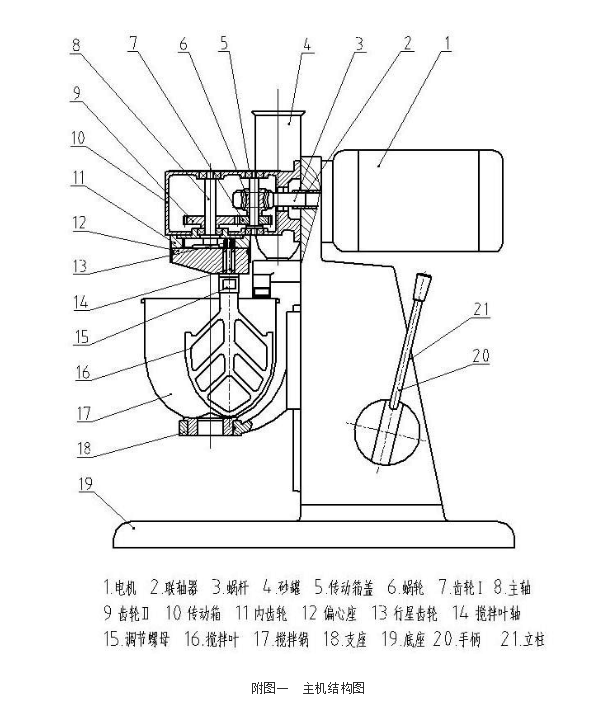 2、工作原理雙速電動機通過聯軸器將動力傳給傳動箱內的蝸桿再經蝸輪及一對齒輪和傳給主軸并減速。主軸帶動偏心座同步旋轉,使固定在偏心座上的攪拌葉進行公轉。同時攪拌葉通過攪拌葉軸上端的行星齒輪圍繞固定的內齒輪完成自轉運動。攪拌鍋與支座用偏心槽旋轉鎖緊、砂罐內加砂子后,可在規定時間自動加砂或手動加砂,手柄用于升降和定位攪拌鍋位置用。